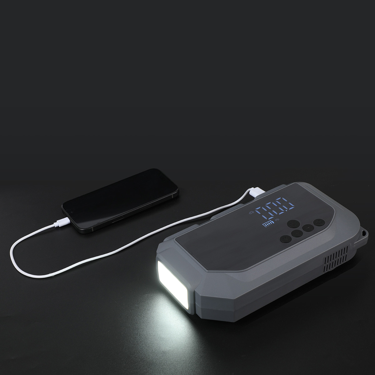Be prepared for any roadside emergency with this compact 10,000mAh jump starter featuring a built-in tire inflator and multi-mode LED flashlight. A QR code is printed on each item providing access to the latest user manual. Delivering up to 800A peak current and 150 PSI inflation, it quickly handles dead batteries and low tires. Includes intelligent safety clamps, valve adapters, USB charging, and a zippered case—an essential all-in-one tool for winter weather and everyday travel.