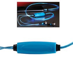 Stand out in a crowd with this set of ear buds that light up and flash to the music. Answer calls with the built-in microphone. (Rechargeable battery) It also comes with a black drawstring pouch. Total length of item is 40".