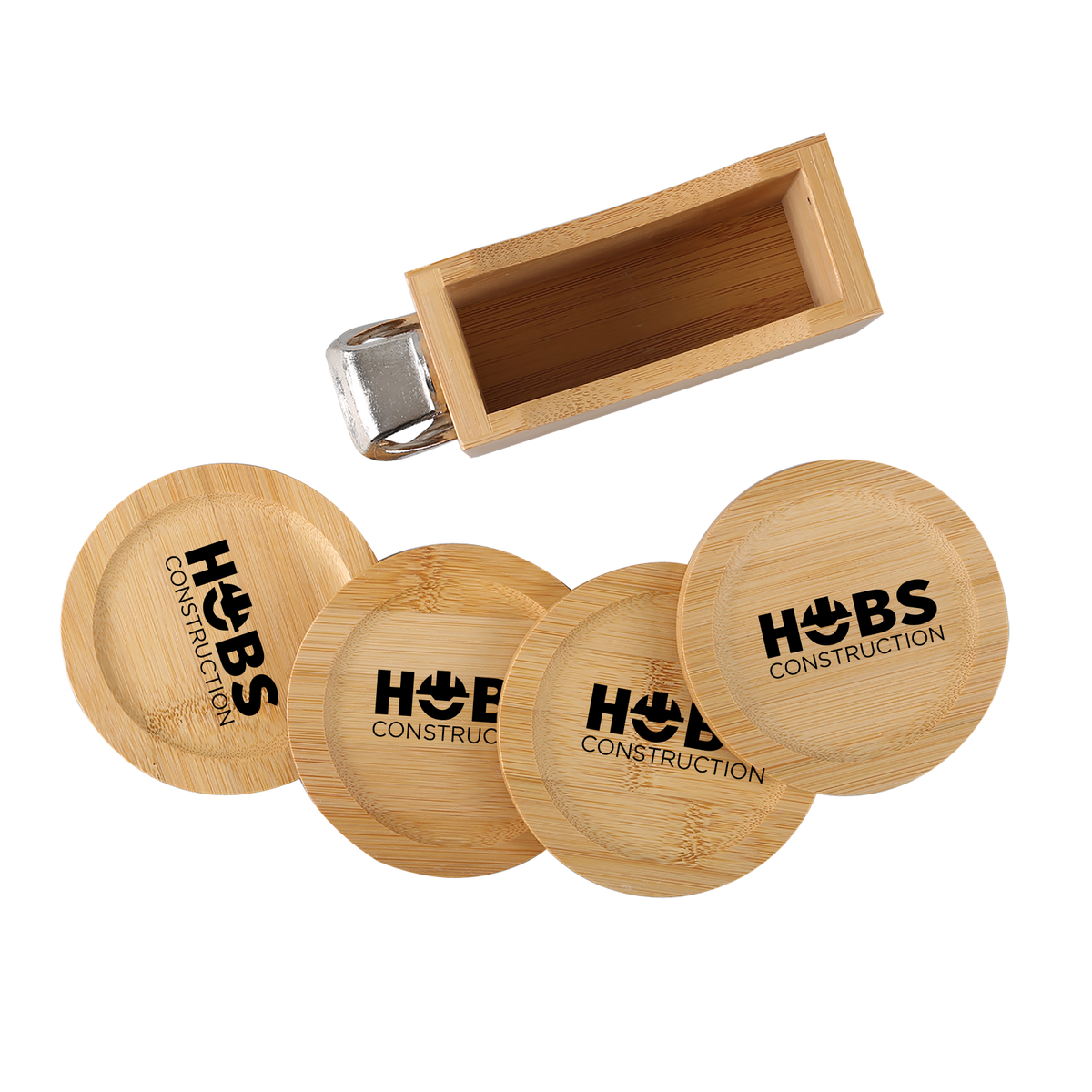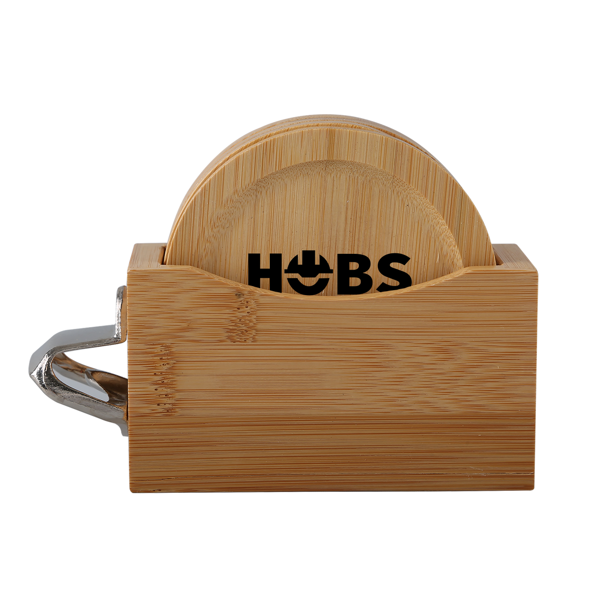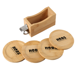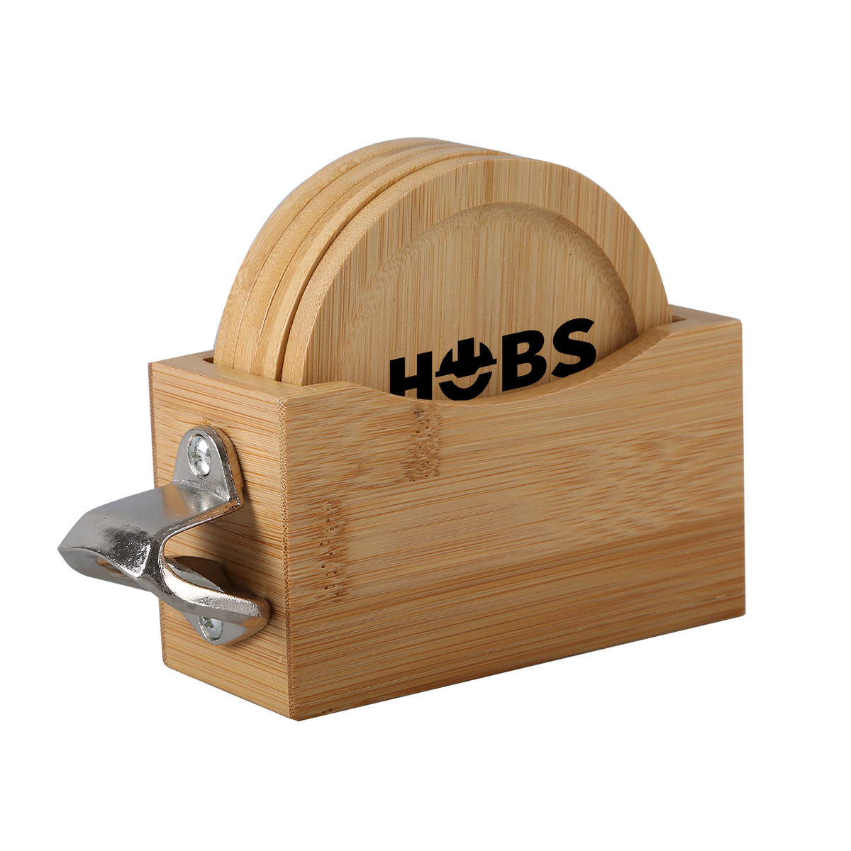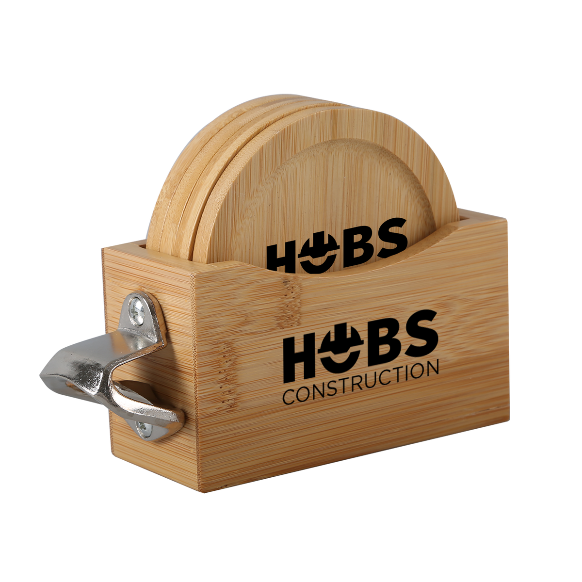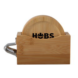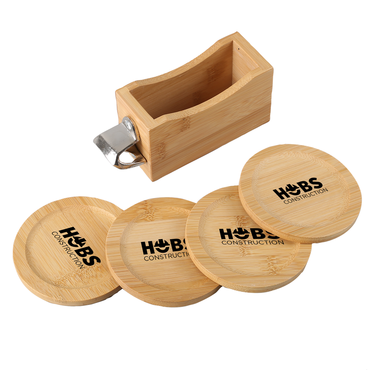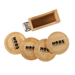 Bamboo Coaster Set includes caddy with 4 round bamboo coasters and bottle opener. Caddy easily stores and stacks the sustainable coasters. Due to natural variations in the grain, laser engraved imprints may have slightly different shades. A tone on tone imprint is common with lasered bamboo.